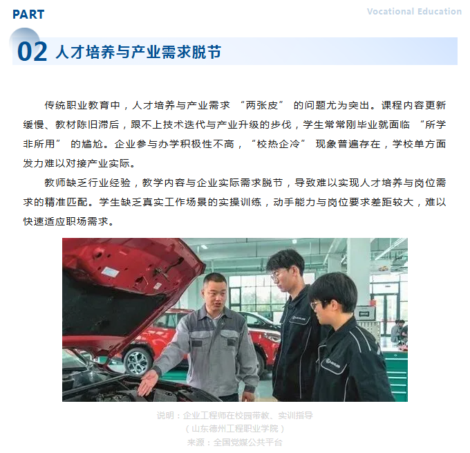 长期以来,职业教育面临产教对接脱节、融合流于形式等问题,既制约自身质量提升,也 难以适配新质生产力发展对高素质技术技能人才的需求。随着 “十五五” 规划相关政策 落地,职业教育正从 “规模扩张” 转向 “质量跃升”,精准破解痛点,为技能人才成 长铺就坚实道路