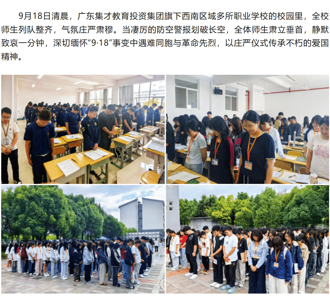 9月18日清晨,广东集才教育投资集团旗下西南区域多所职业学校的校园里,全校师生列队整齐,气氛庄严肃穆。当凄厉的防空警报划破长空,全体师生肃立垂首,静默致哀一分钟,深切缅怀“9·18”事变中遇难同胞与革命先烈,以庄严仪式传承不朽的爱国精神。