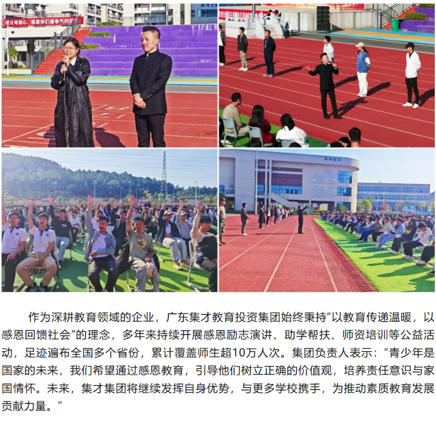 近日,广东集才教育投资集团感恩教育宣讲团受邀走进江西吉安科技学校,为全校2000余名师生带来了一场主题为传递感恩·点燃梦想的大型感恩励志演讲活动。