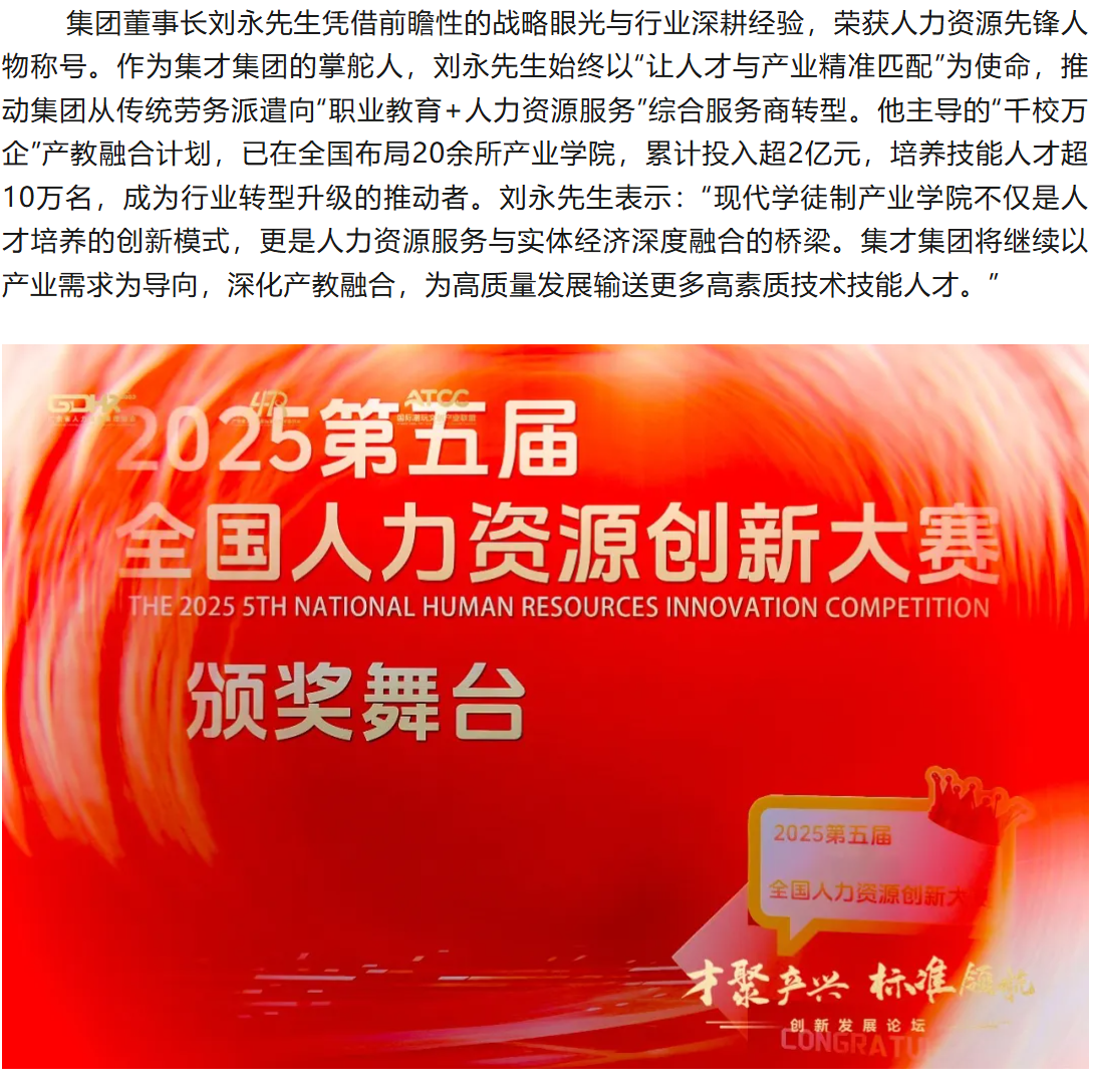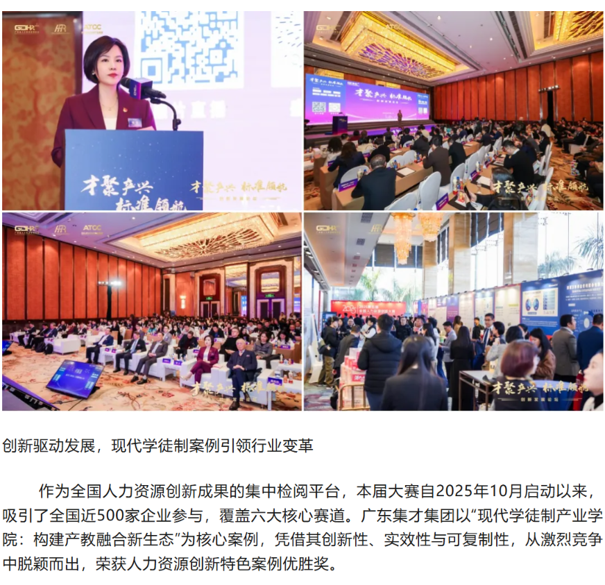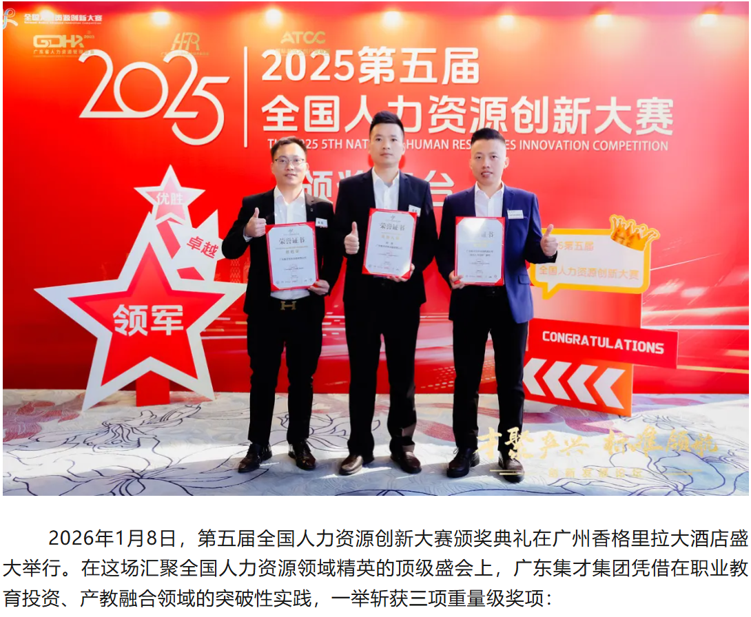 第五届全国人力资源创新大赛颁奖典礼在广州香格里拉大酒店盛大举行。在这场汇聚全国人力资源领域精英的顶级盛会上,广东集才集团凭借在职业教育投资、产教融合领域的突破性实践,一举斩获三项重量级奖项