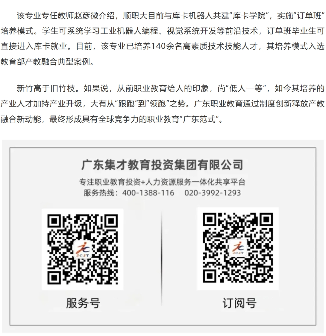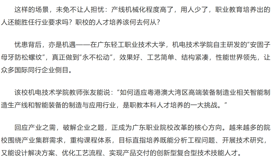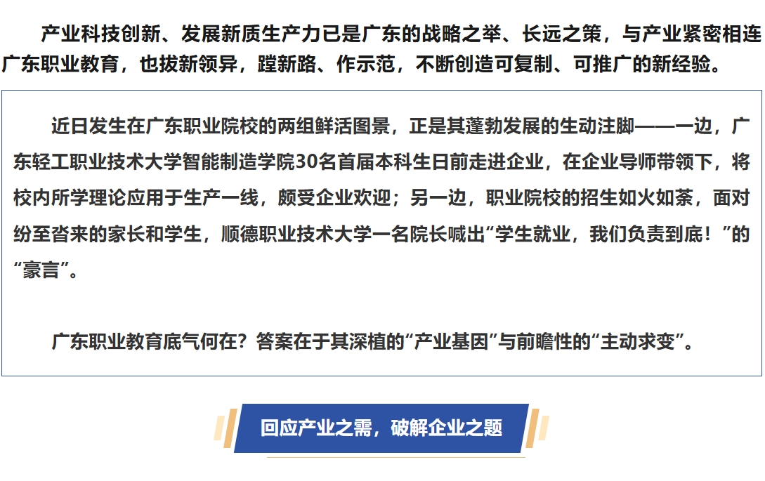 产业科技创新、发展新质生产力已是广东的战略之举、长远之策,与产业紧密相连广东职业教育,也拔新领异,蹚新路、作示范,不断创造可复制、可推广的新经验。