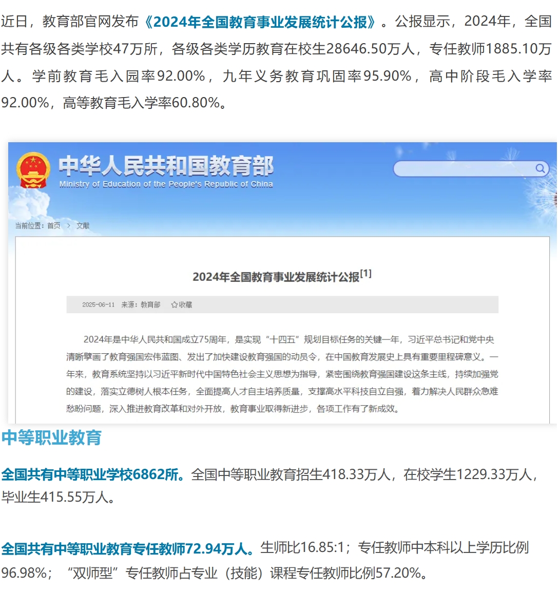 全国共有中等职业学校6862所。全国中等职业教育招生418.33万人,在校学生1229.33万人,毕业生415.55万人。