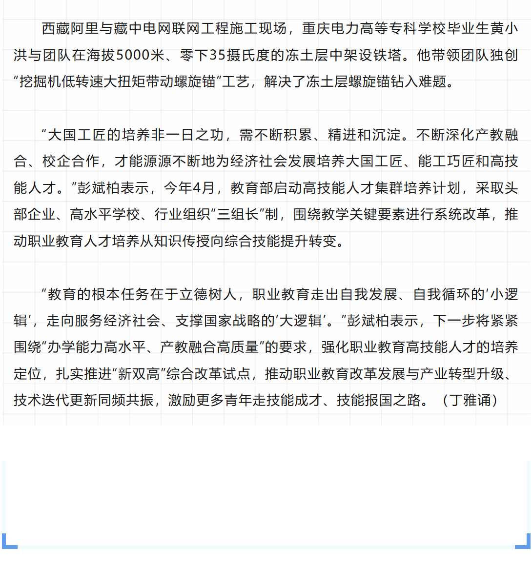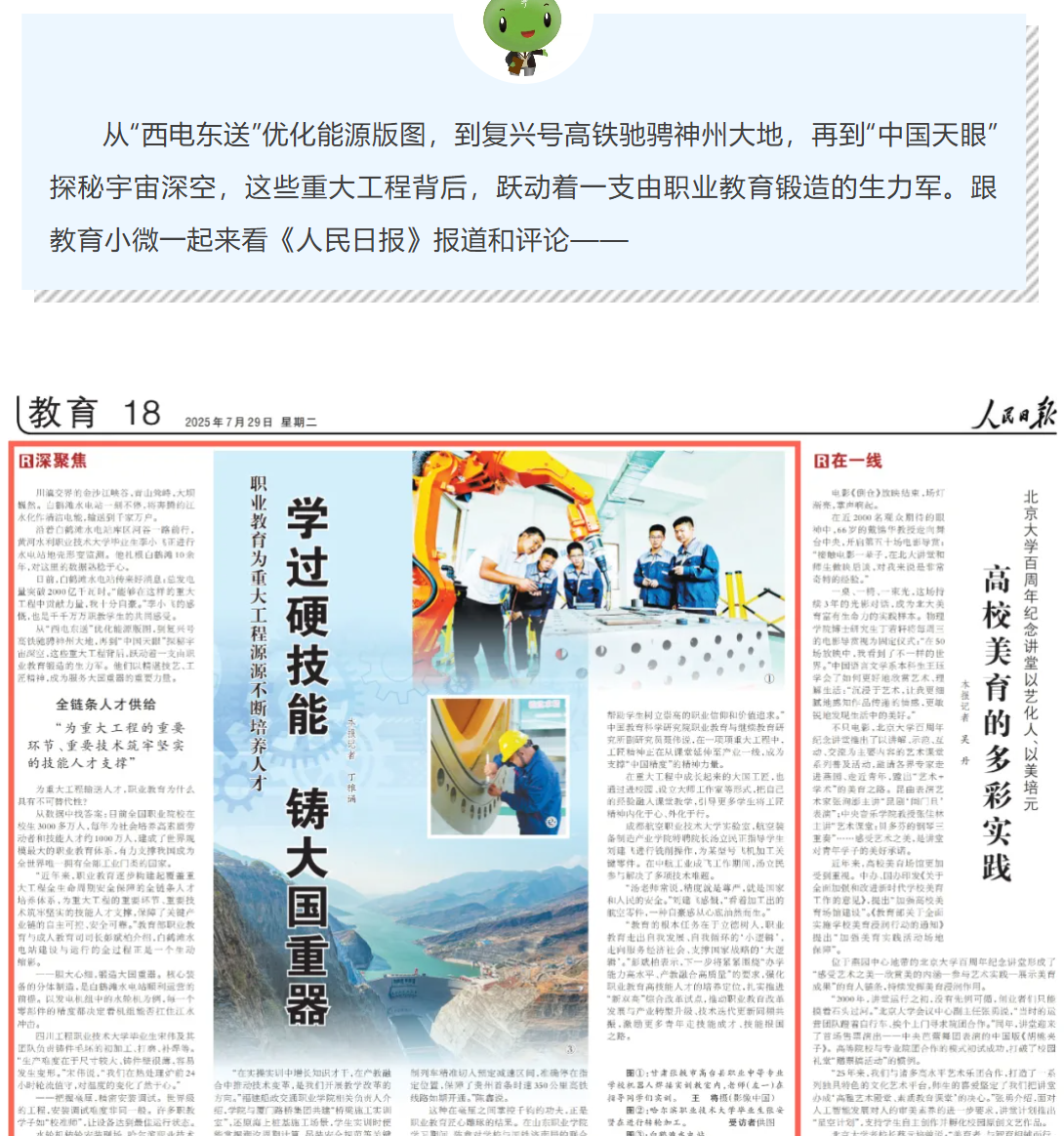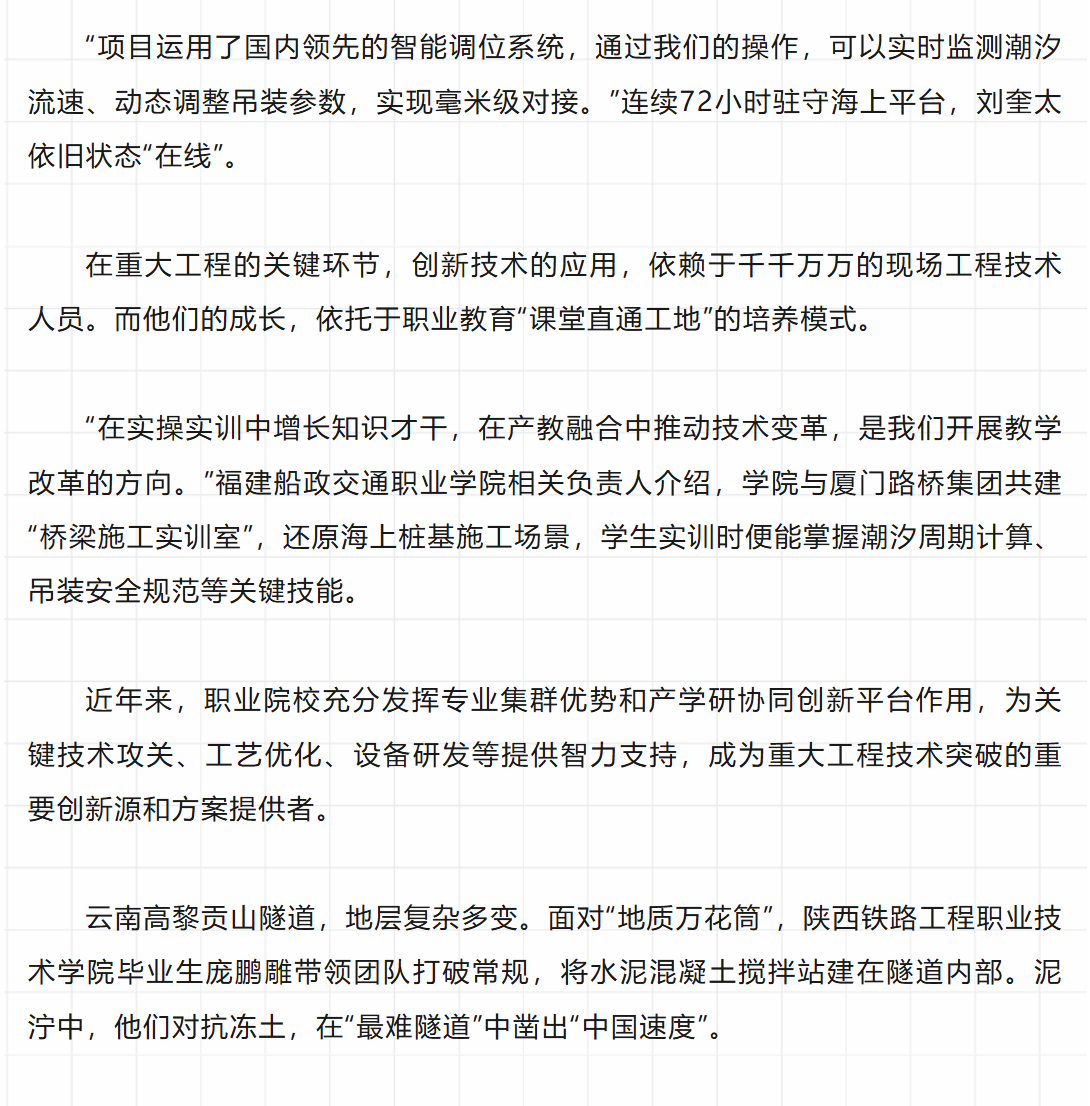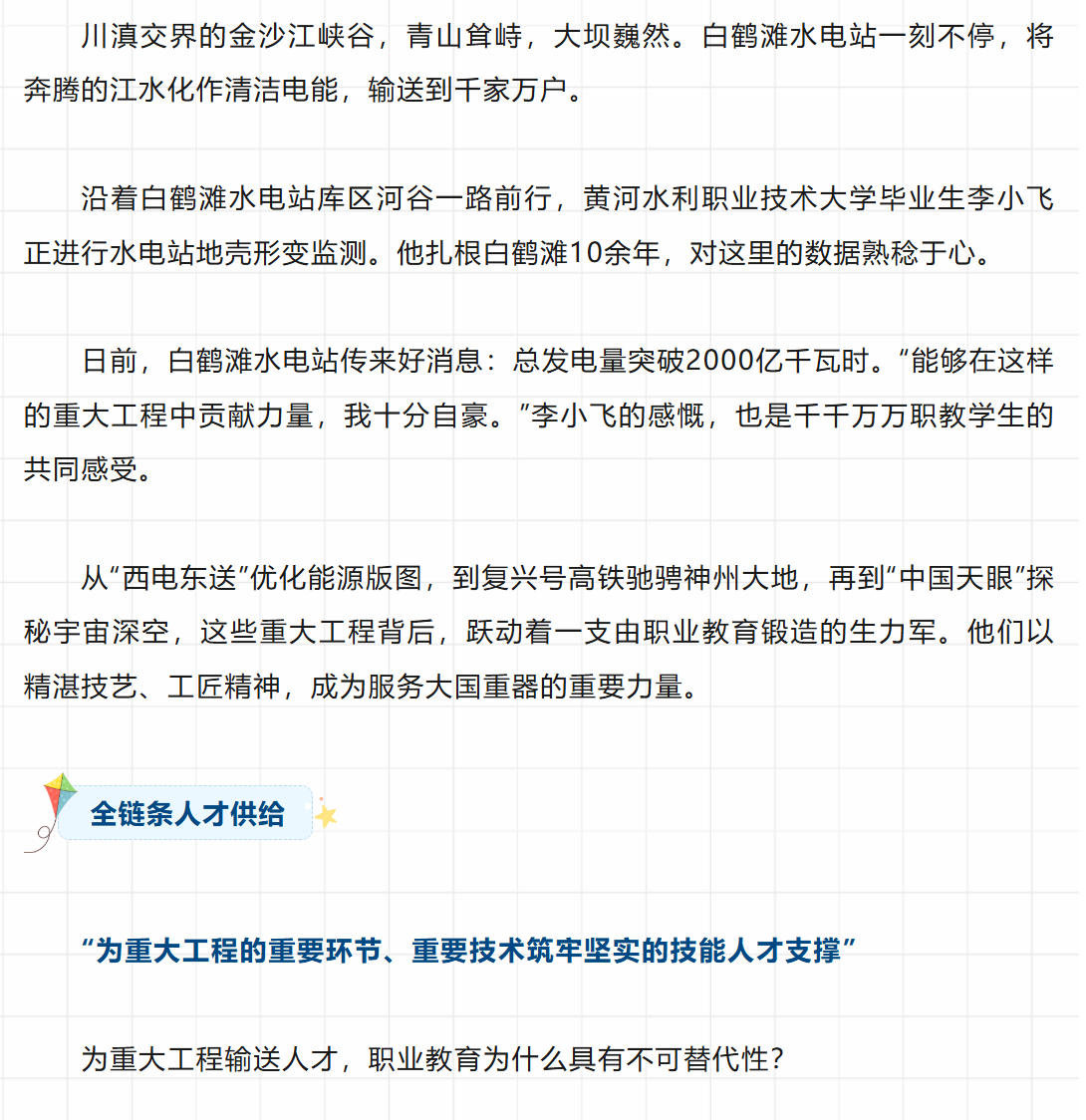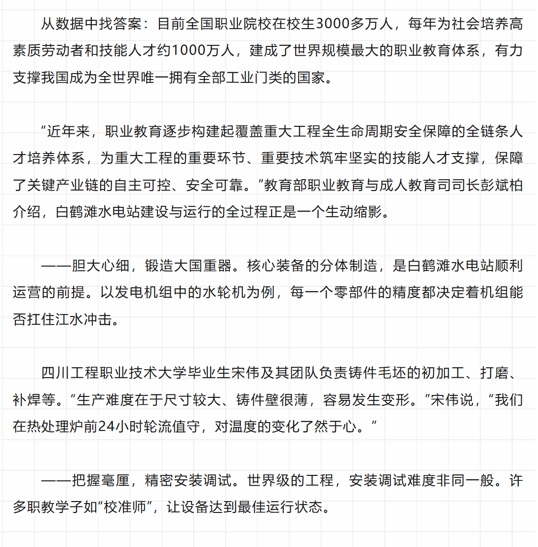 从西电东送优化能源版图,到复兴号高铁驰骋神州大地,再到中国天眼探秘宇宙深空,这些重大工程背后,跃动着一支由职业教育锻造的生力军。跟教育小微一起来看