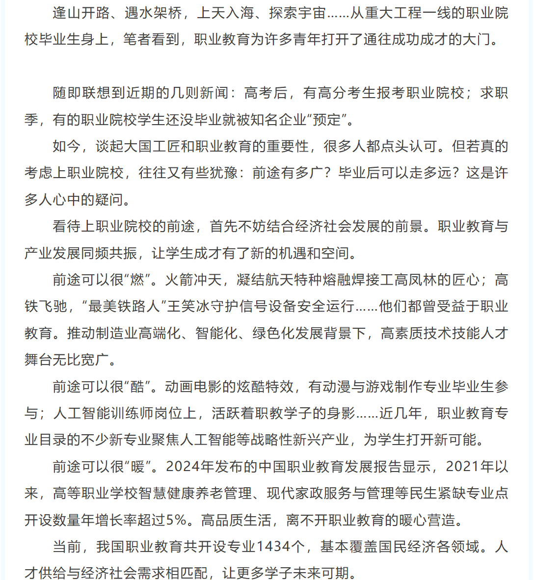逢山开路、遇水架桥,上天入海、探索宇宙……从重大工程一线的职业院校毕业生身上,笔者看到,职业教育为许多青年打开了通往成功成才的大门。