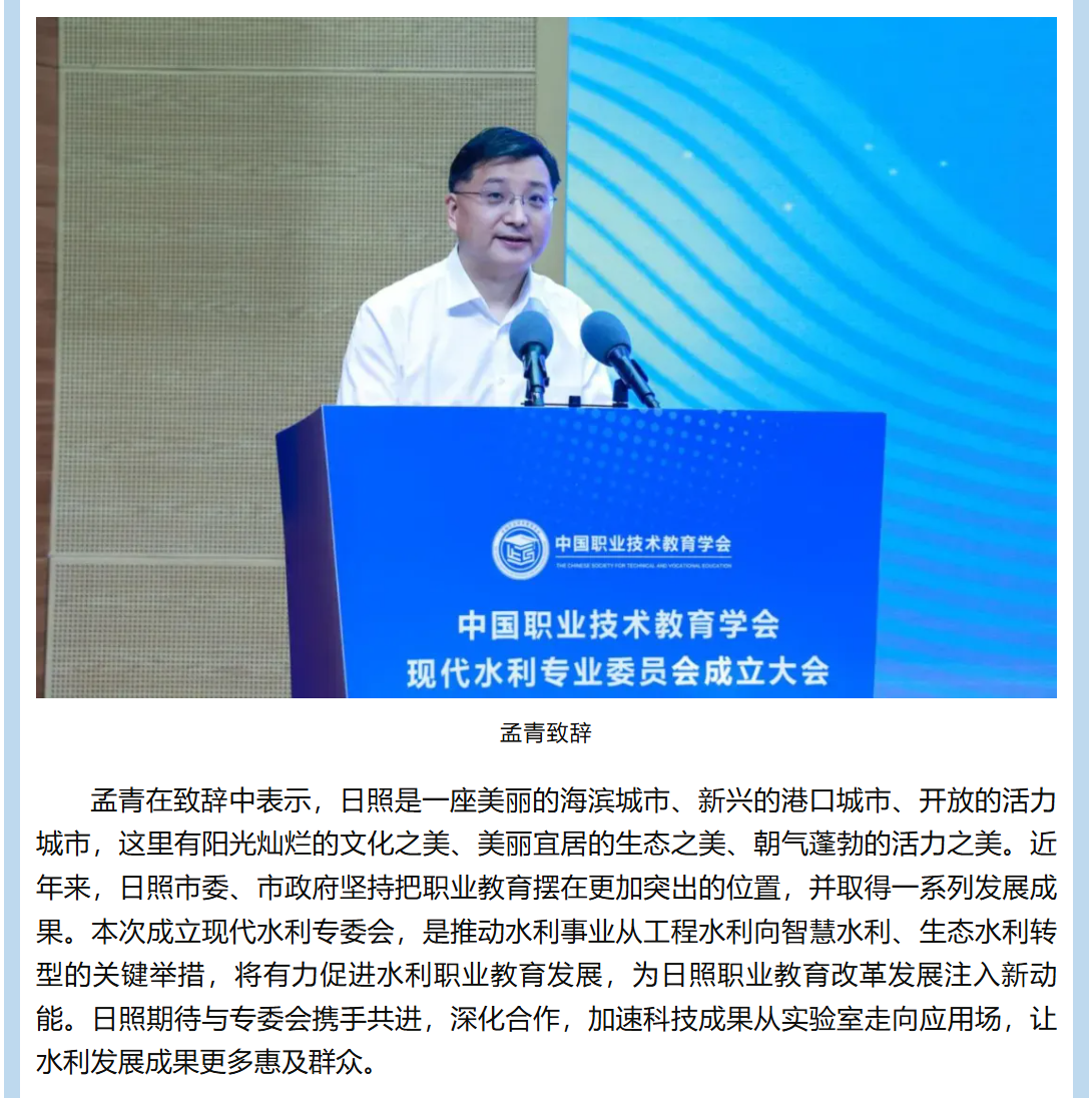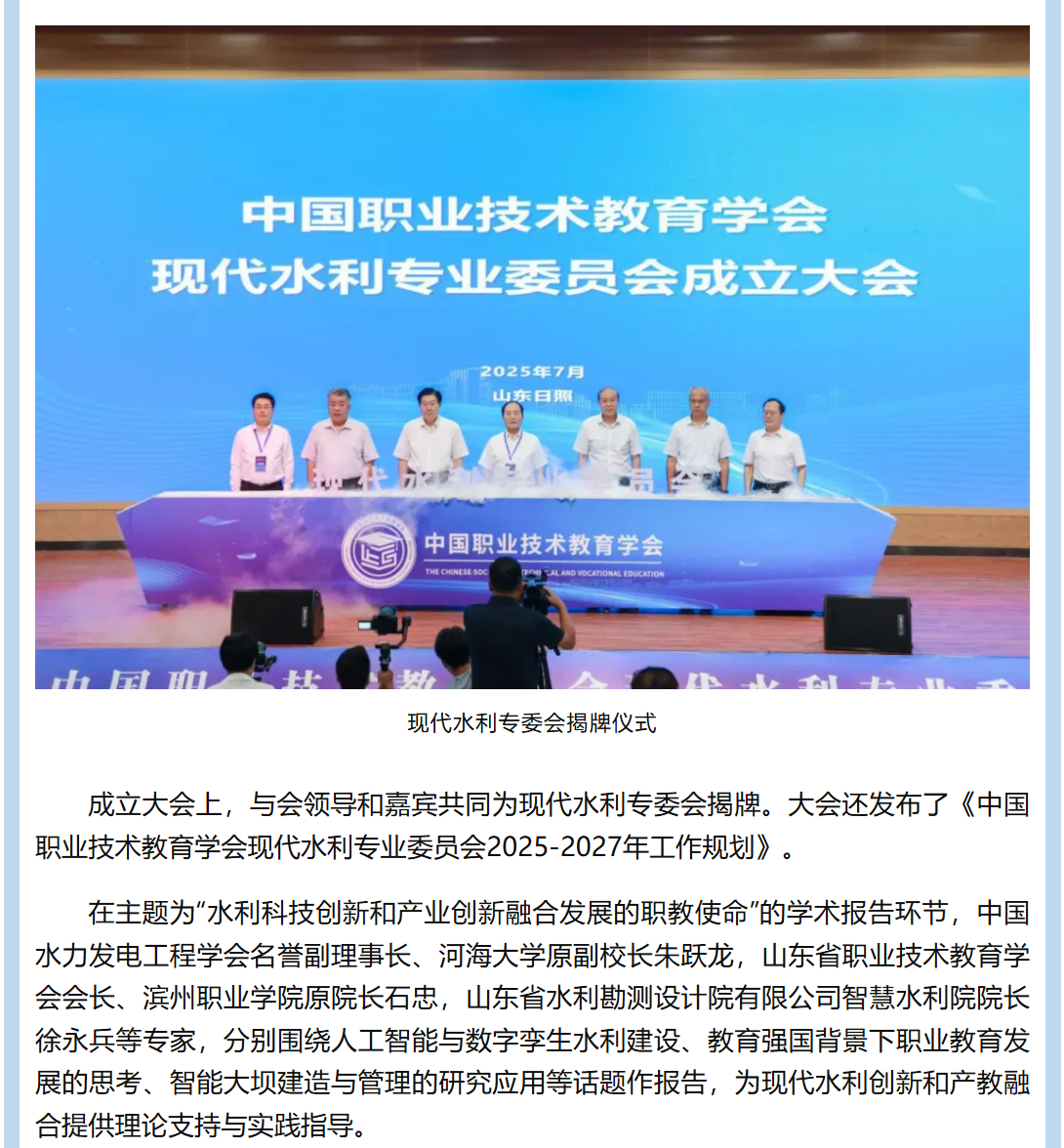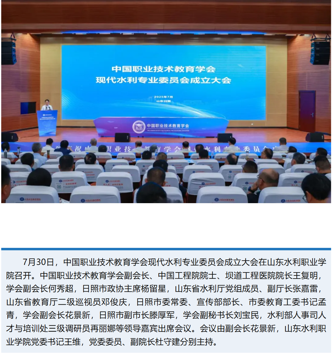 7月30日,中国职业技术教育学会现代水利专业委员会成立大会在山东水利职业学院召开。中国职业技术教育学会副会长、中国工程院院士、坝道工程医院院长王复明,学会副会长何秀超,日照市政协主席杨留星