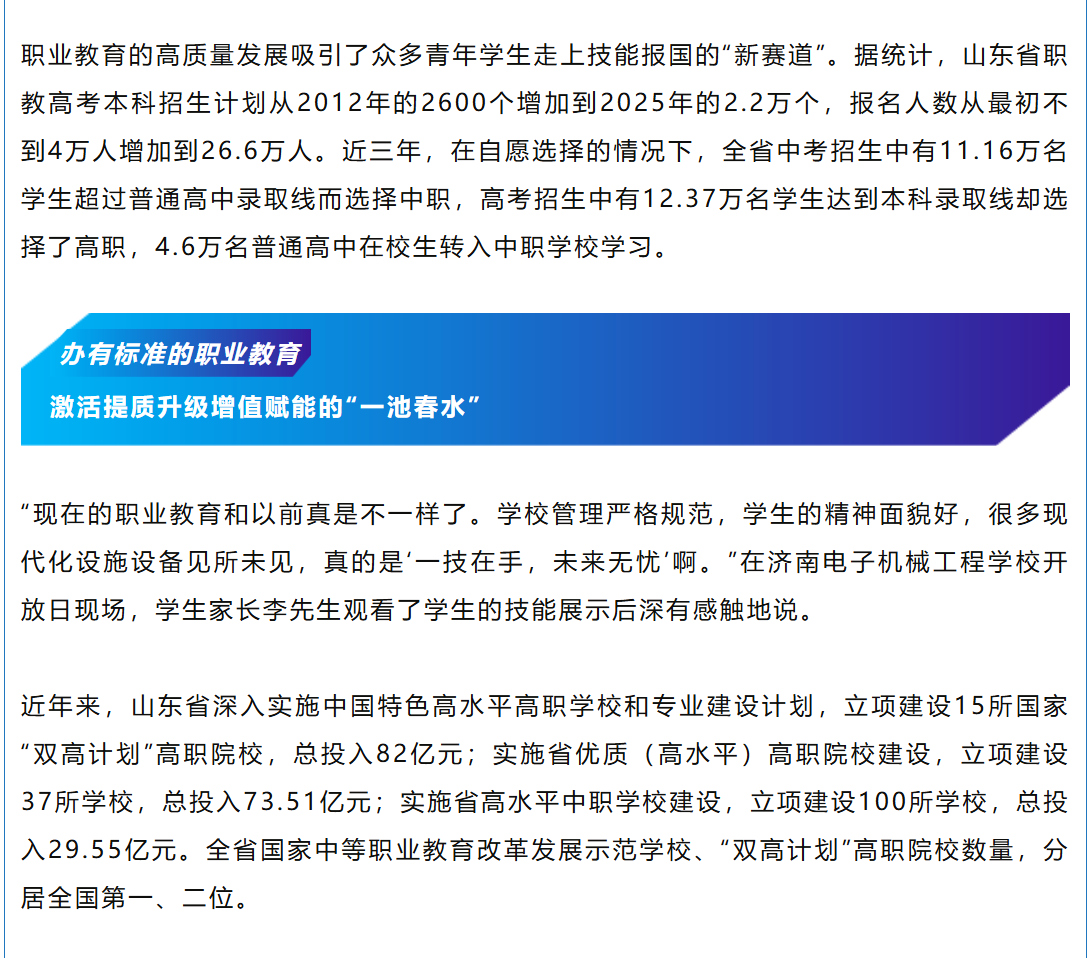 山东是全国首个部省共建职业教育创新发展高地、首批省域现代职业教育体系新模式试点省份,2025年再次被确定为全国职业教育新双高全口径改革试点省份,肩负着先行先试、示范引领的使命。