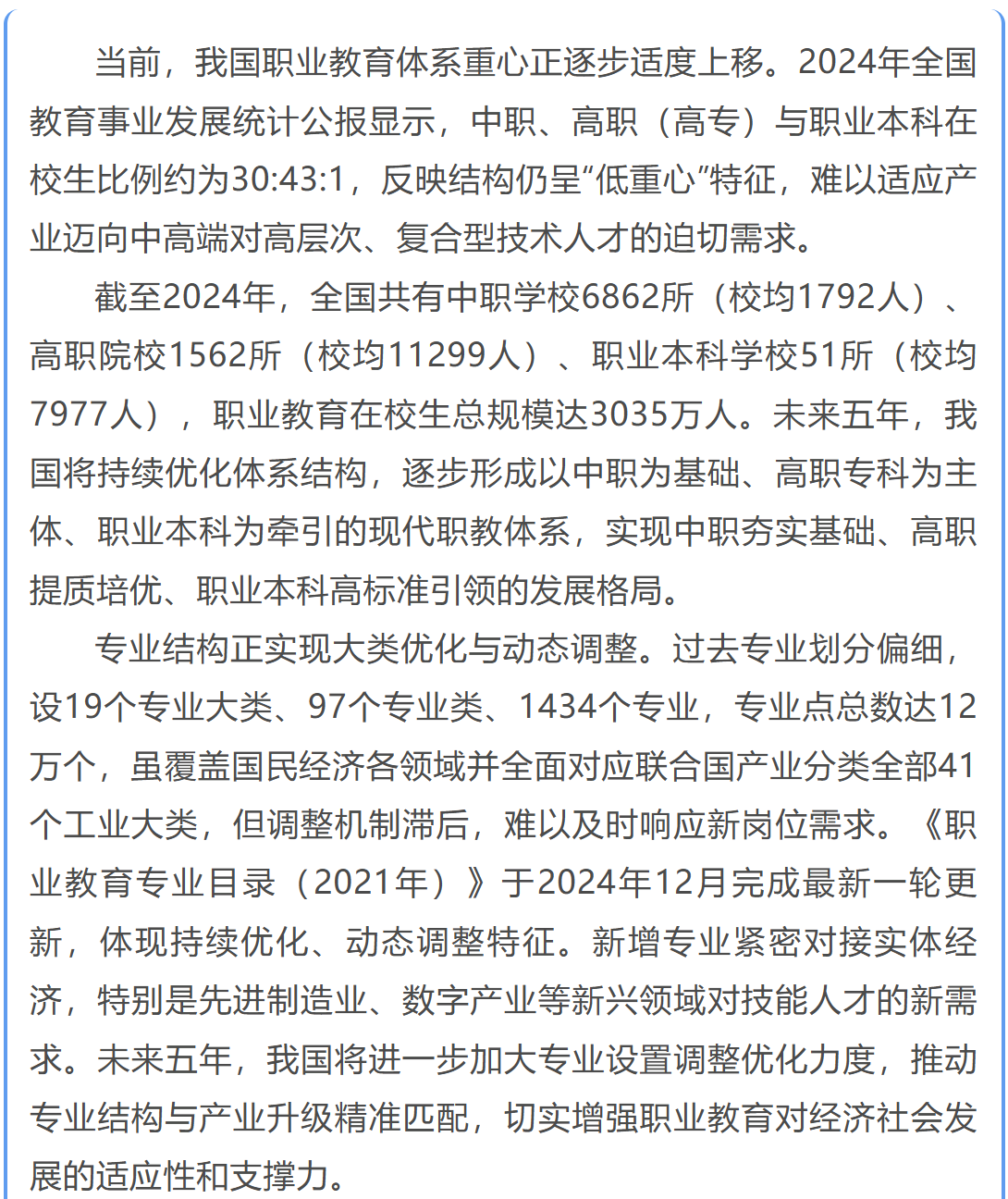 我国建成世界规模最大的职业教育体系,中职、高职与职业本科结构比例持续优化,助力学生就业有本领、升学有路径、终身发展有支撑。专业布局紧密对接国家战略和区域经济需求