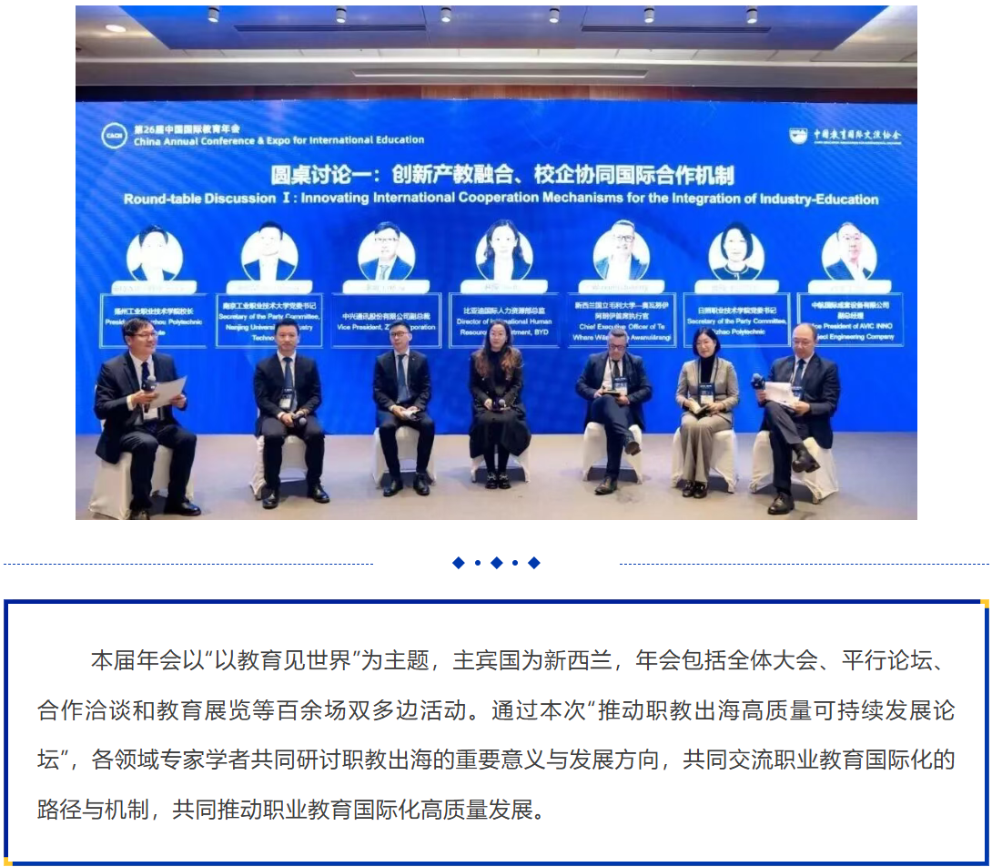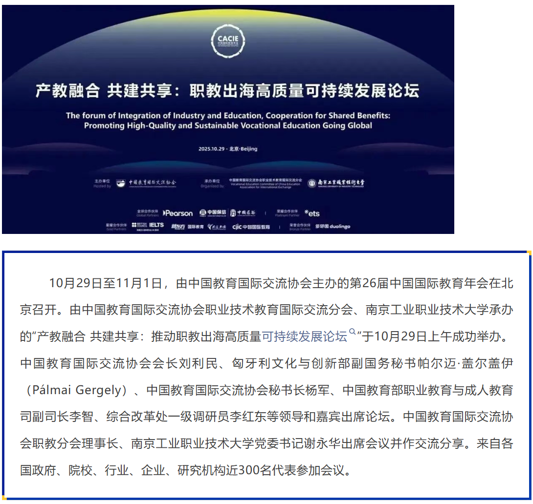 10月29日至11月1日,由中国教育国际交流协会主办的第26届中国国际教育年会在北京召开。由中国教育国际交流协会职业技术教育国际交流分会、南京工业职业技术大学承办的