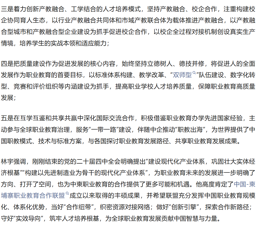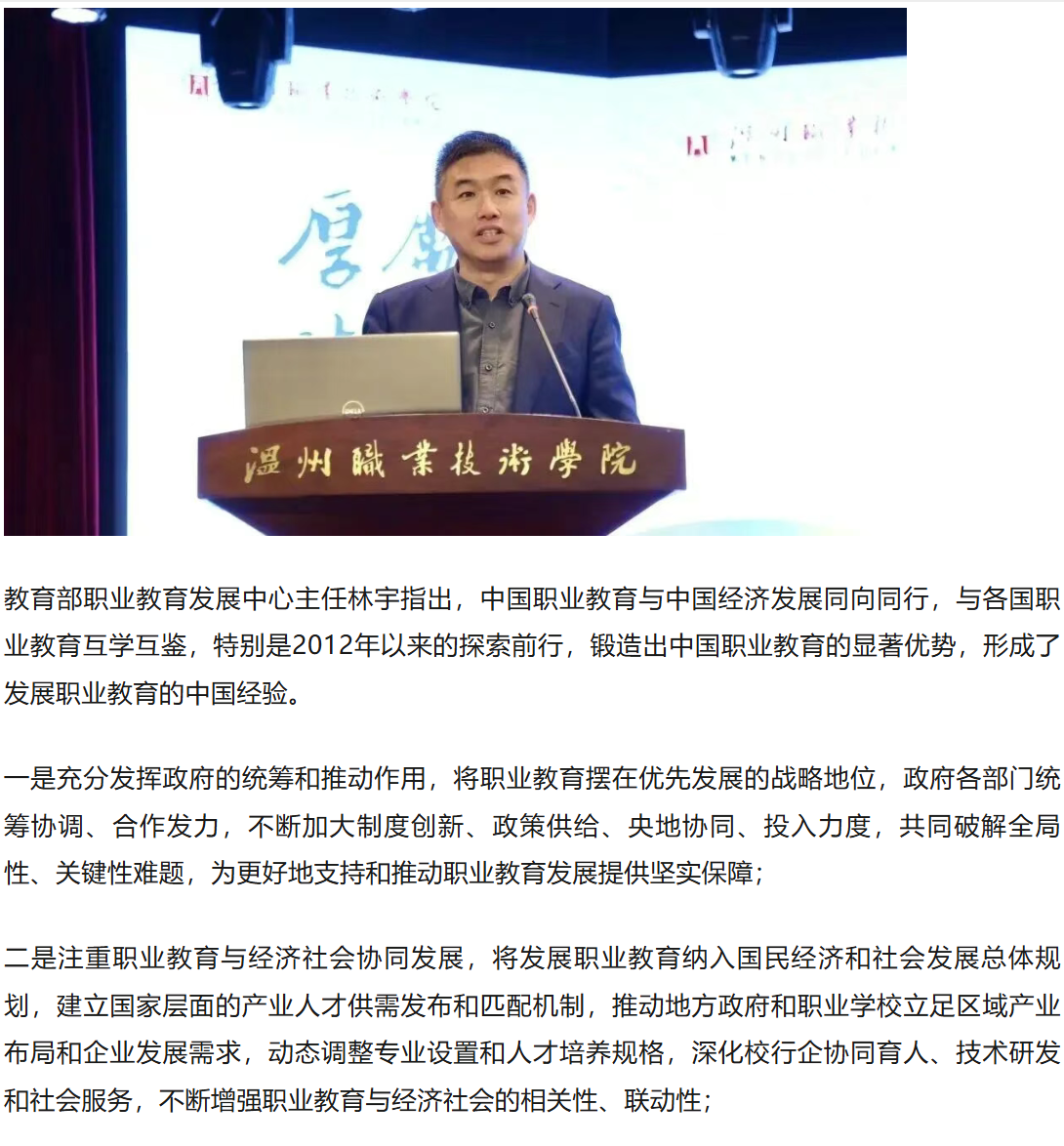 教育部职业教育发展中心主任林宇指出,中国职业教育与中国经济发展同向同行,与各国职业教育互学互鉴,特别是2012年以来的探索前行,锻造出中国职业教育的显著优势,形成了发展职业教育的中国经验。
