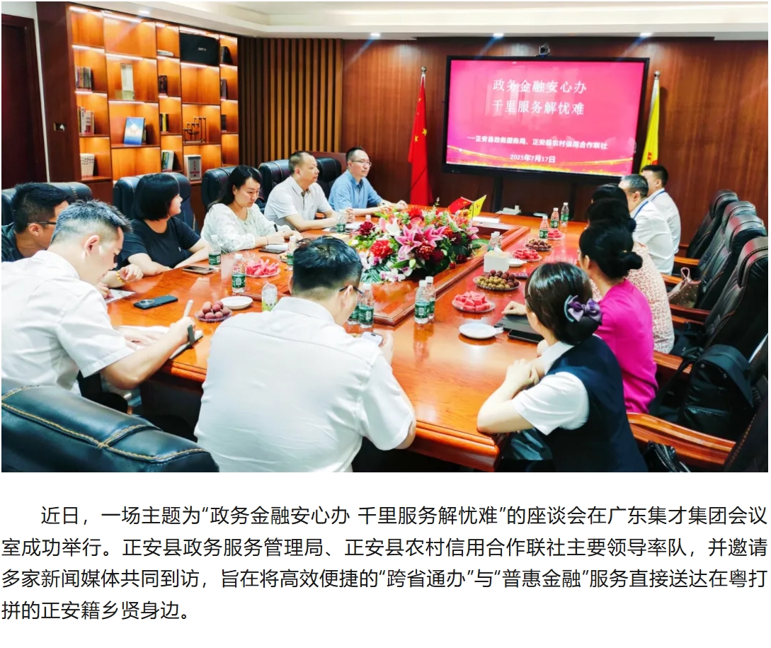 近日,一场主题为政务金融安心办 千里服务解忧难的座谈会在广东集才集团会议室成功举行。正安县政务服务管理局、正安县农村信用合作联社主要领导率队,并邀请多家新闻媒体共同到访