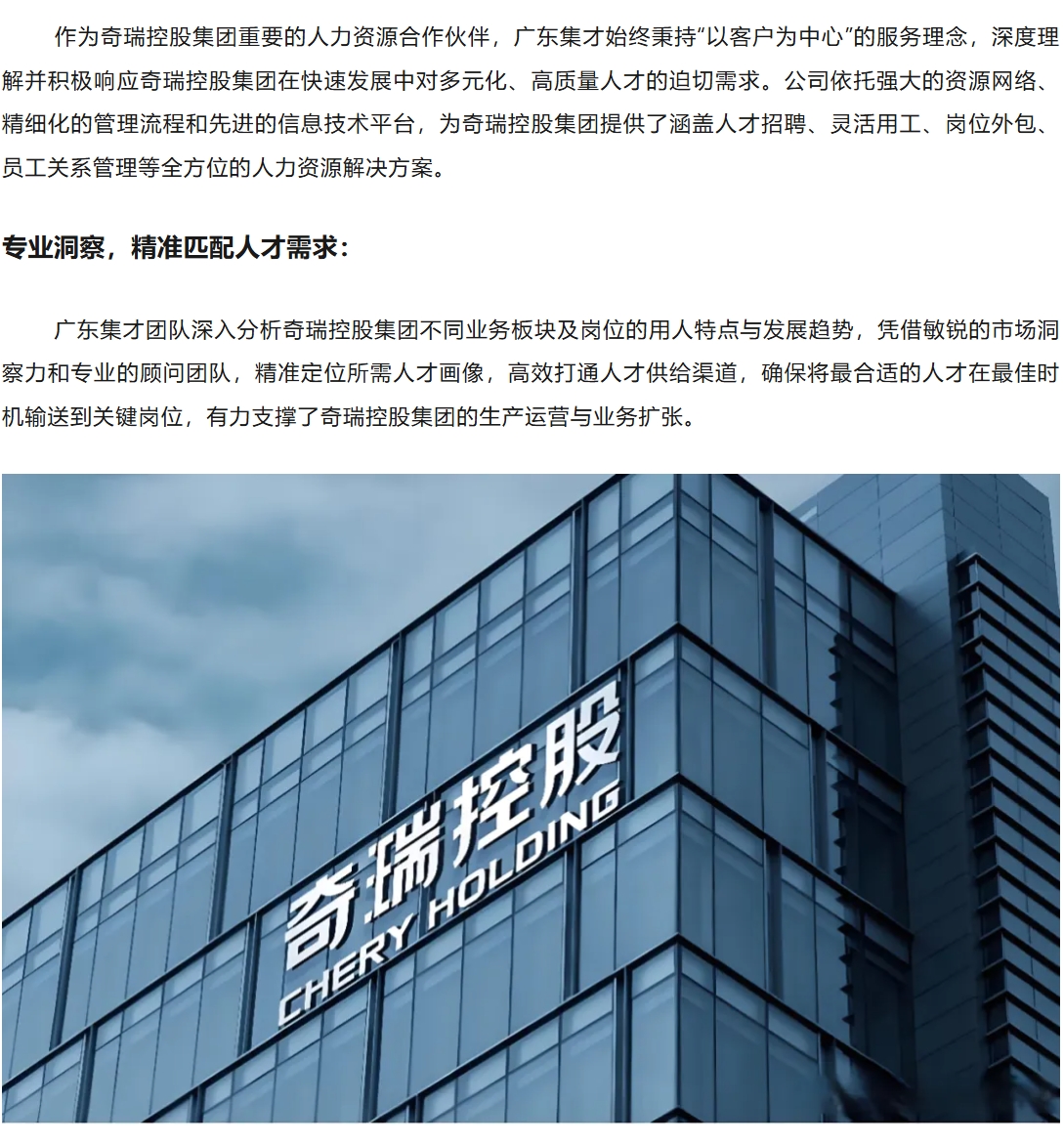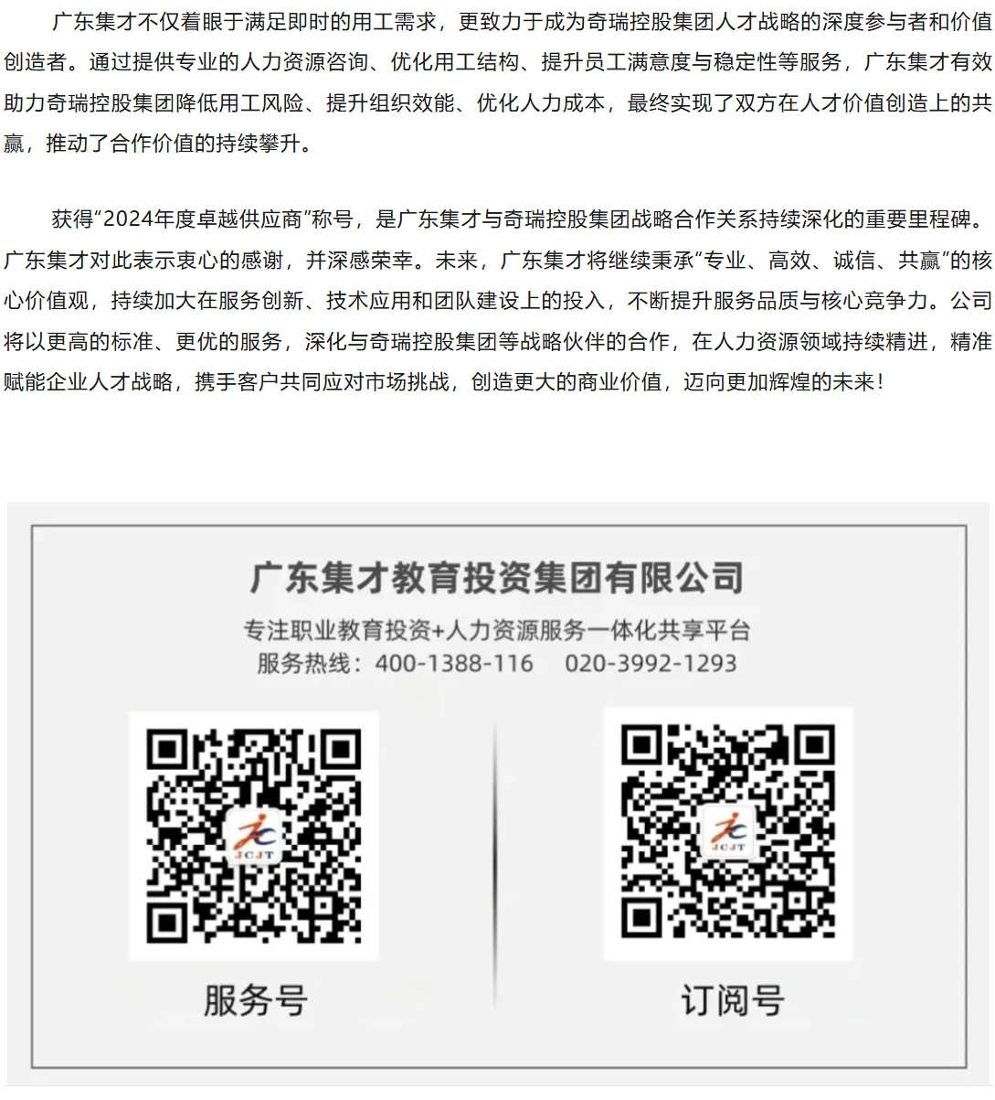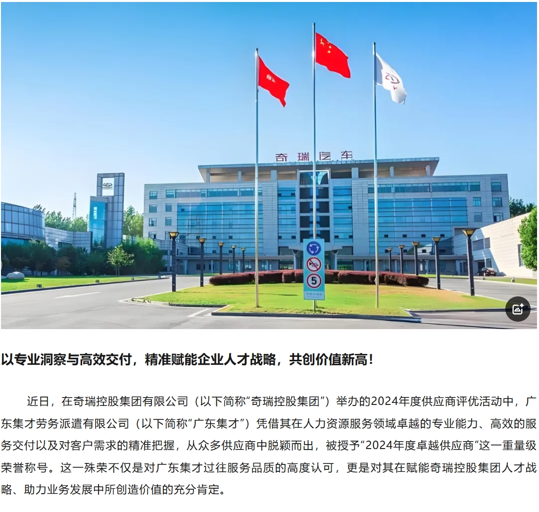 集才新闻 | 广东集才劳务派遣有限公司荣膺奇瑞控股集团2024年度卓越供应商称号
