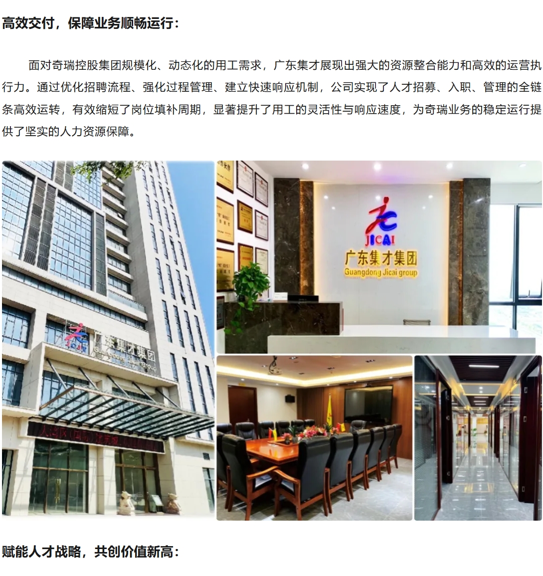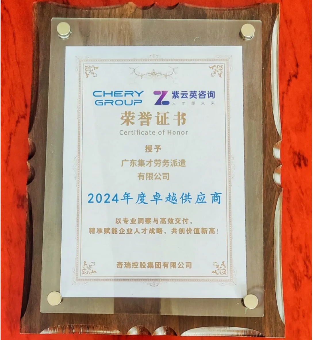 近日,在奇瑞控股集团有限公司举办的2024年度供应商评优活动中,广东集才劳务派遣有限公司凭借其在人力资源服务领域卓越的专业能力、高效的服务交付以及对客户需求的精准把握