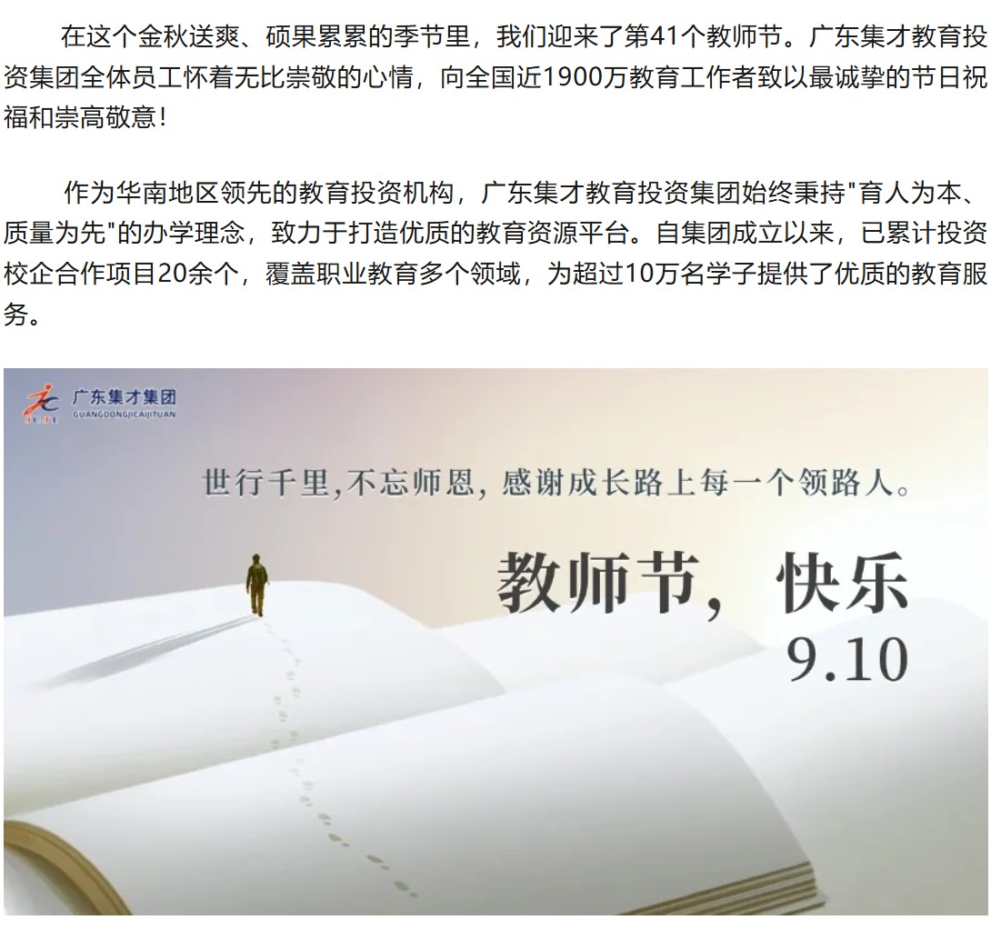 在这个金秋送爽、硕果累累的季节里,我们迎来了第41个教师节。广东集才教育投资集团全体员工怀着无比崇敬的心情,向全国近1900万教育工作者致以最诚挚的节日祝福和崇高敬意!