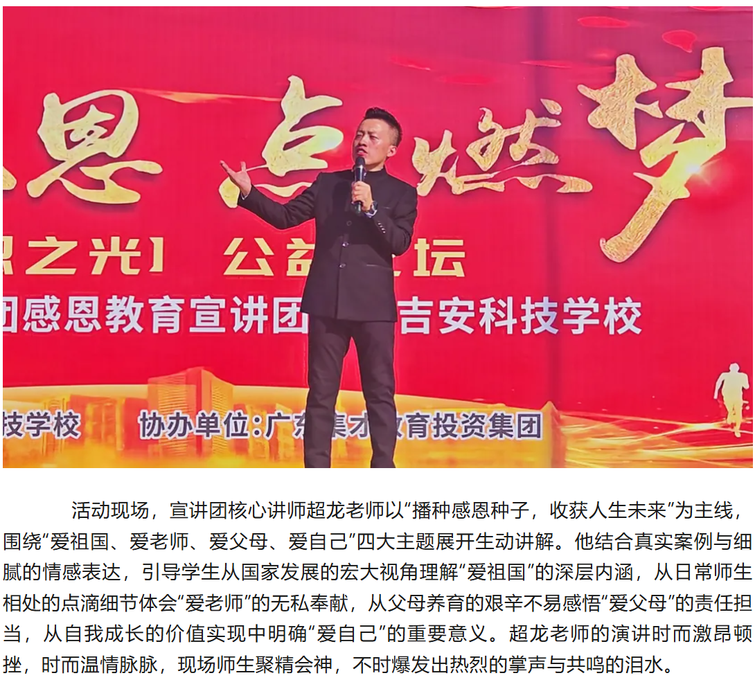 近日,广东集才教育投资集团感恩教育宣讲团受邀走进江西吉安科技学校,为全校2000余名师生带来了一场主题为传递感恩·点燃梦想的大型感恩励志演讲活动。