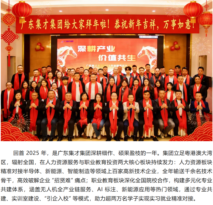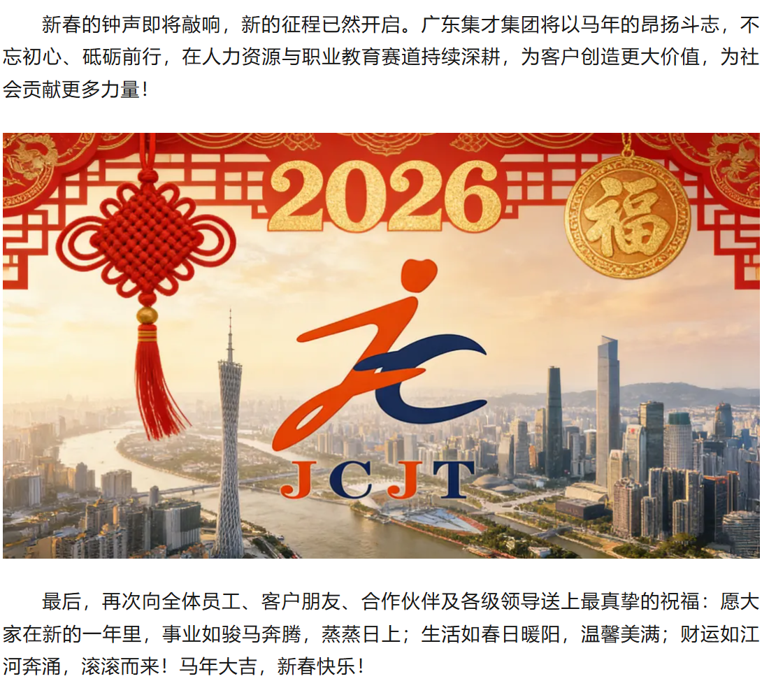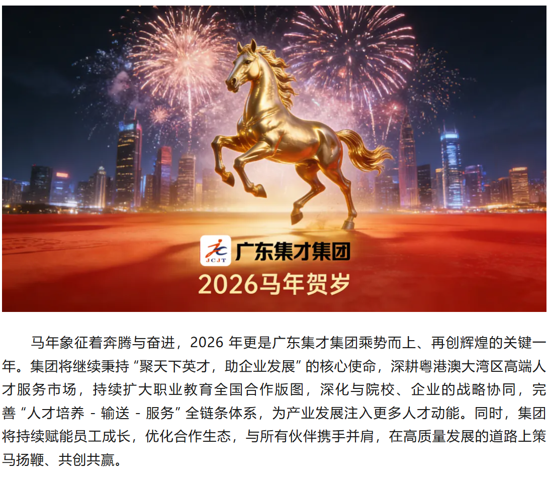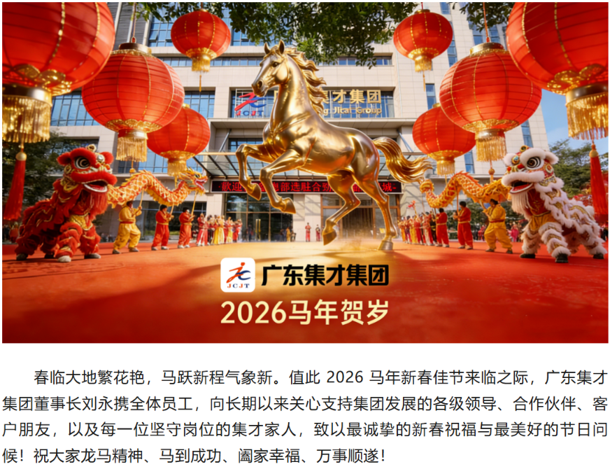 春临大地繁花艳,马跃新程气象新。值此 2026 马年新春佳节来临之际,广东集才集团董事长刘永携全体员工,向长期以来关心支持集团发展的各级领导、合作伙伴、客户朋友,以及每一位坚守岗位的集才家人,致以最诚挚的新春祝福与最美好的节日问候!祝大家龙马精神、马到成功、阖家幸福、万事顺遂!